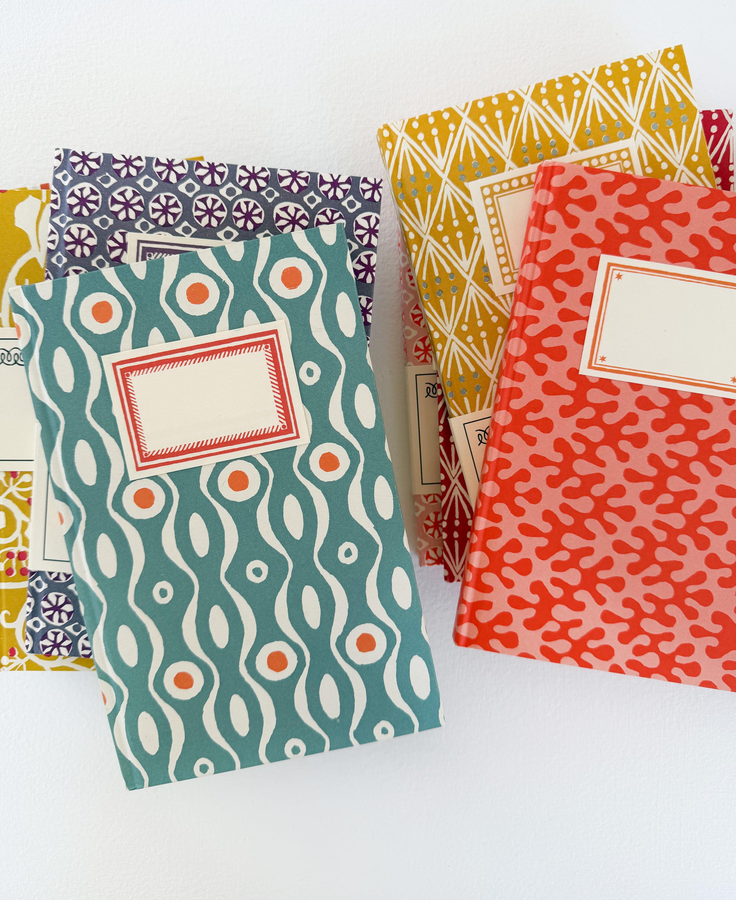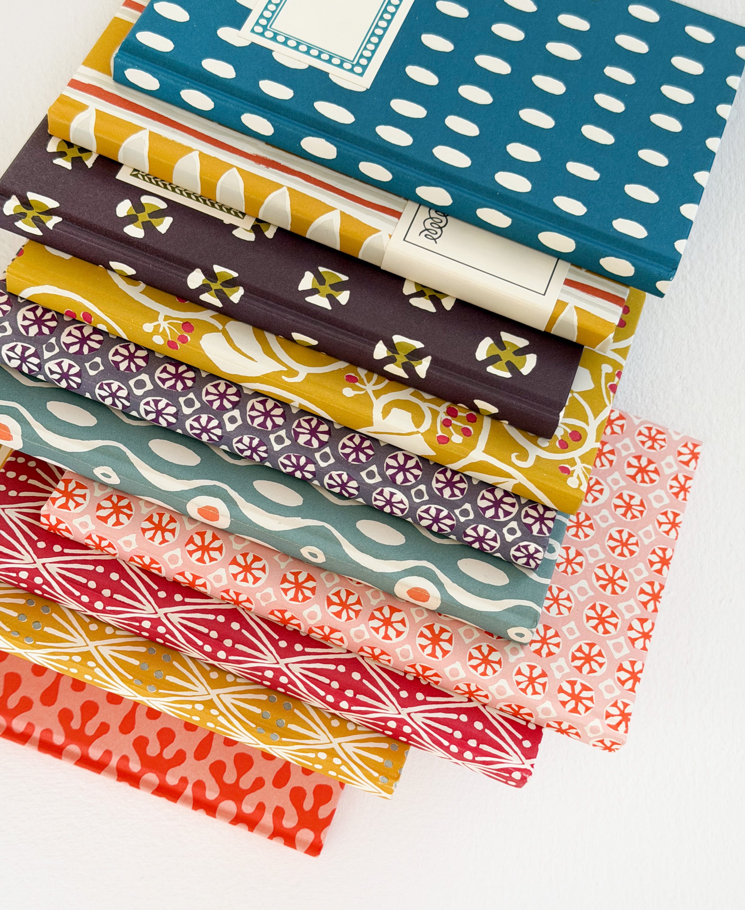 They have 80 pages of plain cream paper, sewn properly and bound into a slim, light hardback notebook, covered in our patterned paper, that opens completely flat.